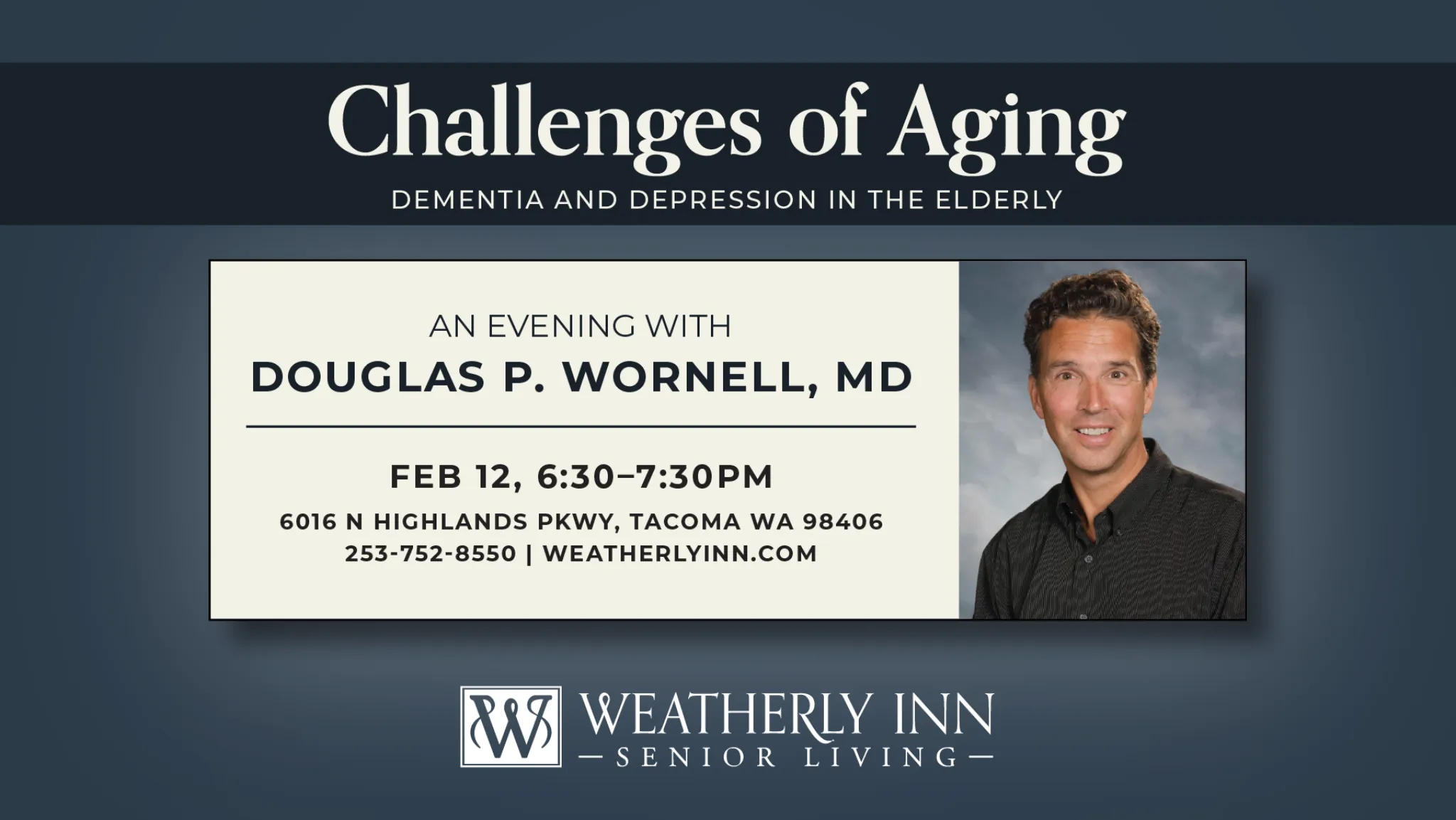 Join us for an evening with Douglas P. Wornell, MD on the Challenges of Aging for the elderly.